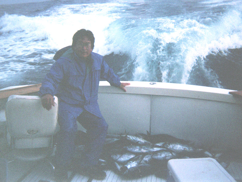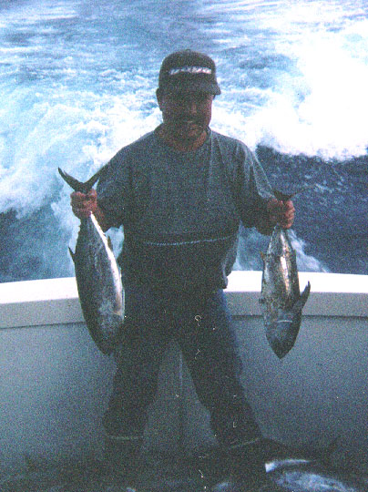 Bruce with two smaller bluefin on a trip where we caught bluefin, albacore and Dorado. As usual just below the 295 bank