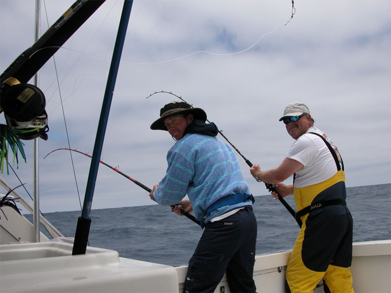 At long last we headed for the 220 spot and Erich and Dennis bring in our first Albacore of the season.