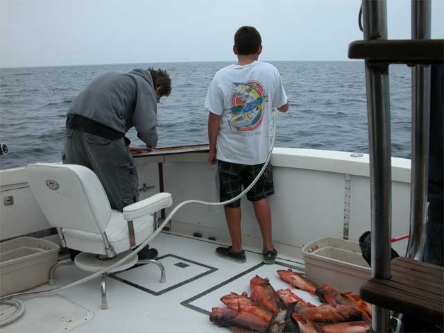 Ken and Bruce (hidden behind the ladder) clean limits of rockfish