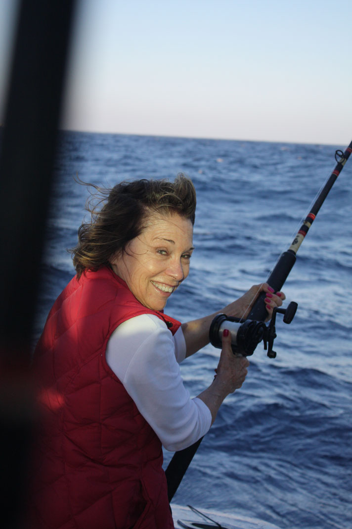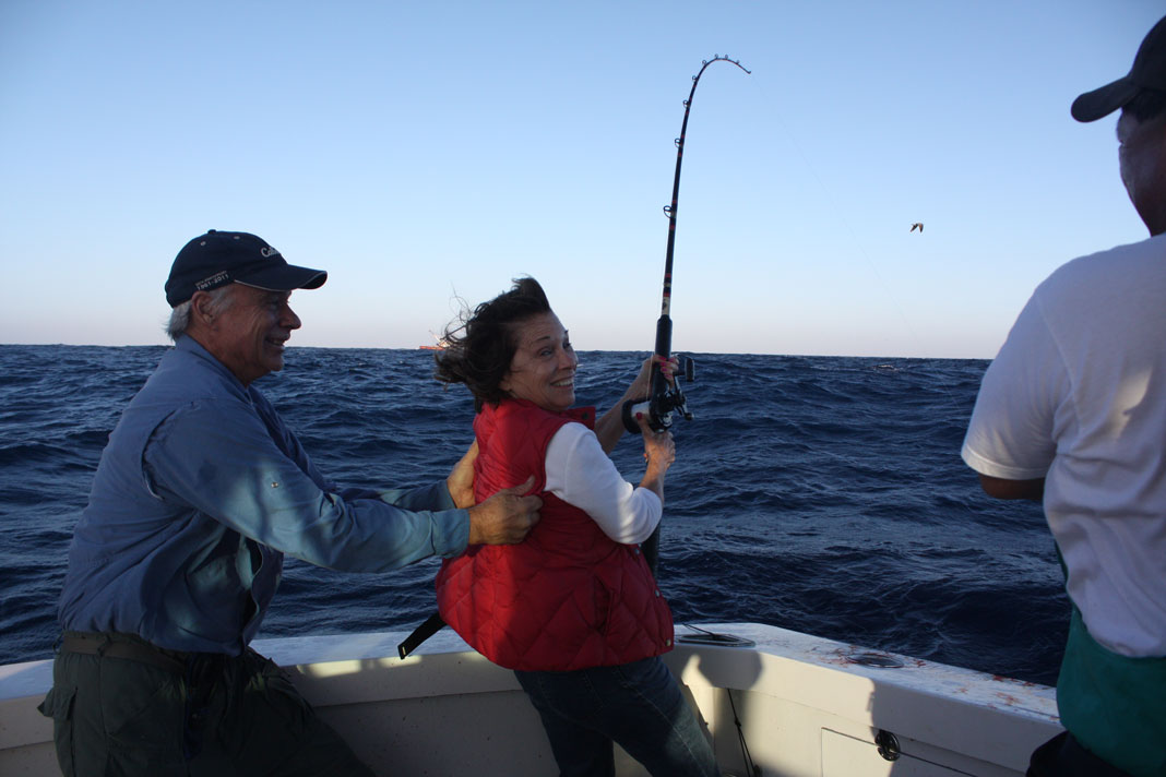 Bruce Willett hangs onto Denny as she fights a bluefin